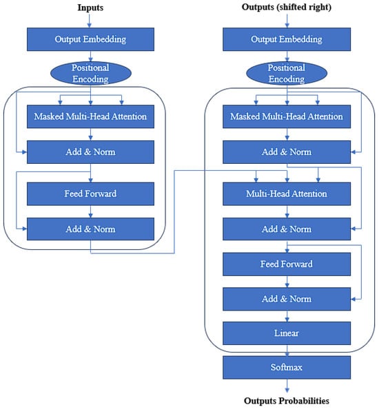 The Attention Mechanism (AM), initially introduced by Bahdanau et al. [61], found its initial application in the field of natural language processing (NLP). The mechanism enables humans to quickly filter high-value information from vast data using limited attentional resources. Although AM has been less commonly applied in the domain of time series prediction, it is frequently employed for feature extraction and often combined with models such as RNN for forecasting time series data. However, the Transformer model, an advancement based on AM, has seen widespread application in time series prediction. The Transformer architecture, initially presented in the work of Vaswani et al. [62], relies entirely on attention mechanisms, specifically self-attention layers, to process sequence data, abandoning the RNN structures commonly used in traditional sequence models. It employs the attention mechanism to maintain a constant distance between any two positions in the sequence, eliminating the need for sequential execution and enabling enhanced parallelism. Figure 14 shows the standard architecture of the Transformer model.