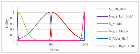 where , p, and denote the shape scale, peak point position, and skewness, respectively. The value of determines whether the shape is symmetric or asymmetric, and an asymmetric shape can be right-skewed ( > 0) or left-skewed ( < 0). Unlike a previous paper that utilized symmetric shapes only [13], we utilize both symmetric and asymmetric forms of Equation (4). By varying the value of as shown in Table 1, we generate six asymmetric shapes over a domain (cf. Section 5.2) with 1000 values (see Figure 2 for an example). Note that the values assigned to p are chosen such that the function generates the same shape in each desirable domain.