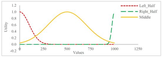 The present study utilizes a quantitative structure, which has been popularly applied as the preference representation in automated negotiations [17]. The utility function of a quantitative structure can be symmetric or asymmetric but must produce a single-peaked shape. In a symmetric utility function, the utility loss similarly deviates above and below the peak point [18], whereas asymmetric utility functions fall into one of two categories: shortfall avoidance (curve following the green squares in Figure 1) or excess avoidance (curve following the purple triangles in Figure 1). In shortfall avoidance, every alternative above the peak is preferred over its symmetric counterpart; that is, for all d, where indicates the deviation from the peak, and U represents utility. Excess avoidance is characterized by the opposite behavior, with .