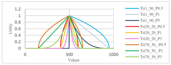 where L and R respectively denote the left and right minima (which meet the horizontal axis); p is a parameter that determines the peak position, and h is the height of the shape. The shape is symmetric if , and it is asymmetric otherwise. With an extra parameter that determines the tightness of the peak’s shape, the general triangular function generates more diverse shapes than the previous two functions. More specifically, setting , , and will generate a narrow-peaked triangle, a standard triangle, and an embowed-peak triangle, respectively. In the present research, three symmetric and six asymmetric shapes were generated from the general triangular function. The chosen parameters are listed in Table 3, and their created shapes are plotted in Figure 4. For all shapes, we set because the permittable utility range is ; that is, if the utility of one negotiation value exceeds 1, then all respective issue values must be normalized within . In addition, to avoid the scalability concerns of attaining similar shapes in all domains, we vary the percentages of L and R as shown in each column of Table 3. Consequently, we must calculate the exact position on the horizontal axis of Figure 4.