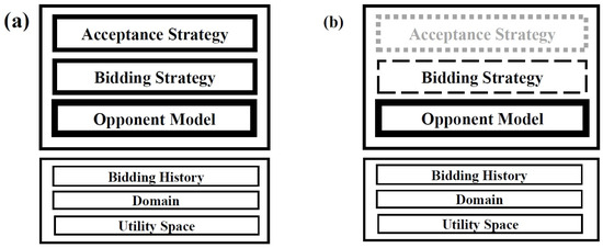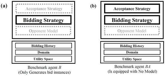 In an experimental analysis of modeling opponents, we require some benchmark agents that either (1) propose bids (B agents that assess the accuracy of the opponent model) or (2) propose bids while considering the acceptance or rejection of the opponent’s bids (BA agents that assess the performance of the opponent model). The latter benchmark agents can assess the performance of the agents once the negotiation ends. During the accuracy assessment, each benchmark agent has a B configuration comprising only a bidding strategy (see Figure 5a) and obeys a BA configuration comprising both a bidding strategy and an acceptance strategy (see Figure 5b); that is, the benchmark agent is devoid of an opponent model and must propose bids only to provide training data, which will be used by another agent analyzing an opponent model. It should be noted that both the bidding and acceptance strategies of the benchmark agent are affected by the selected single-peaked utility function.