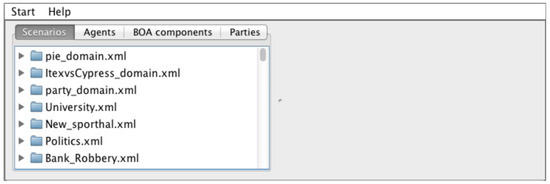 A negotiation domain includes all negotiation issues and their values. In this research, the domains are considered as common knowledge with variable sizes and subjects. Furthermore, the negotiation issues are linear; that is, they are independent and do not affect the utilities of each other. The single-peaked preferences are implemented as underlying utility functions that assign a proper utility to every negotiation item. To satisfy the definition and properties of single-peaked preferences, the issue(s) of the domains must be monotonic. For the present experiments, we extract seven domains with this property from the Genius repository [26]. Figure 7 presents a schematic representation of the GENIUS framework immediately following its initialization (refer to [27] for a comprehensive user guide for GENIUS). We also deactivate the discount factor’s effect () and set . These seven domains are detailed below and are summarized in Table 6.