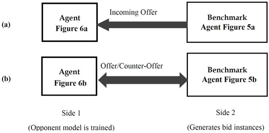 Configuration for evaluating the opponent model of a rival: (a) B benchmark agent for accuracy assessment; (b) BA benchmark agent for performance assessment [13].
