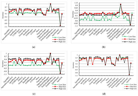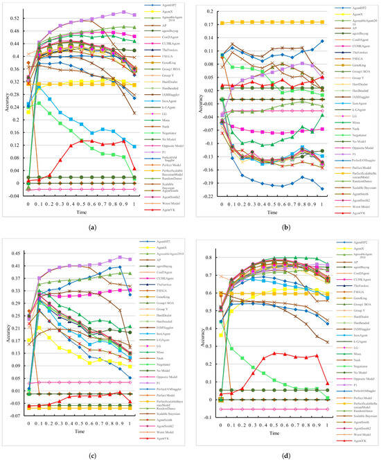 - Let be the accuracy of an opponent model in a size-i domain, and let S, M, and L denote small, medium, and large domains, respectively.The accuracies of the opponent models in modeling the utility functions of all benchmark agents (Figure 10a) decrease as the domain size increases. Specifically, the accuracy is highest in large domains, followed by medium domains, and it is lowest in small domains:Separating the benchmark agents into Gaussian, skew-normal, and general triangular and referring to Figure 10b–d, respectively, the accuracies of the opponent models confronting all benchmark agents of type i in a size-j domain are ordered as follows:This does not show any specific association between the degree of the utility function and the size of the domain it is negotiating on.