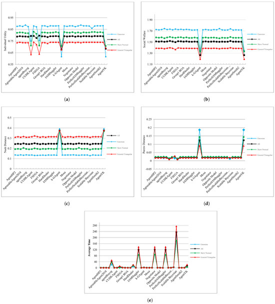 - Now suppose that , , and respectively signify the individual utility, social welfare, and Nash distance of the opponent models in category i, and that Gaussian, Skew, and Triangular correspond to the Gaussian, skew-normal, and triangular benchmark agents, respectively. From Figure 11a–c, it follows that the performances of the opponent models in each category is as follows:leading to the following proposition: