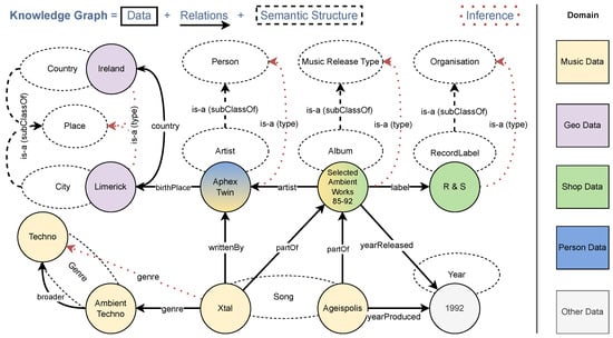 Simplified Knowledge Graph (KG) example demonstrating integrated information from five domains, showcasing ten entities of eight types connected by twelve relationships (two distinct is-a relations). Dashed lines indicate semantic structures (ontology or graph schema), such as entity types. Inferences can be made based on the relationships and typing, revealing additional information such as the broader birthplace of Aphex Twin being Ireland and Xtal belonging to the Techno genre (Not all possible inferences are shown for clarity).