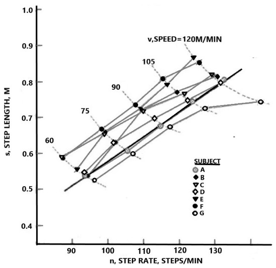 When the subject walks freely, they usually adopt a pattern that is almost identical to the one described in Equation (2). Figure 1 shows the s/n walking mode of the example. A bold continuous line was drawn in the form of Equation (2). The sin relationship shown in Figure 1 is basically linear for all subjects, but there are significant differences between subjects (such as B, C, and G). However, due to a 10% increase in the s/n ratio of typical subjects (walking speed = m/min), energy expenditure only increased by 0.7% compared to the optimal level. Therefore, subjects can change their walking mode near the optimal ratio without significantly increasing their energy expenditure. At the same speed, even if sin increases by 20%, it will only increase by 2.6%. In natural walking, step length is uniquely correlated with step frequency through Equation (2). If speed is chosen as the independent variable and Equation (2) is used, Equation (1) will be simplified to the following natural walking equation: