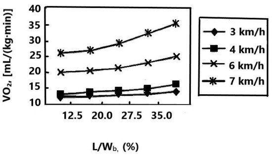 The results in Figure 2 indicate that the relationship between oxygen consumption (VO) and load (LW) during flat ground load travel should be strictly nonlinear. However, when the speed is low, for example, km/h, the relationship is basically linear, when the speed is high, the nonlinear relationship will gradually become significant. There have been many studies on weight-bearing travel and some empirical equations have been proposed to represent this relationship, with international legal units being used uniformly. Some of the main equations are as follows [14]: