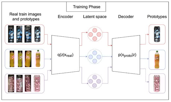 In the VPE, two primary phases can be delineated: the training and testing stages. During the training phase Figure 1, the encoder transforms input images from the real domain into a latent distribution denoted as . Furthermore, in this research, prototypes are included alongside real training images as inputs to the encoder, significantly enhancing the results achieved. Consequently, the prototype becomes a potent signal. Subsequently, the decoder reconstructs the encoded distribution into a prototype corresponding to the input image. In the testing phase Figure 2, the trained encoder serves as a feature extractor. Both test images and prototypes from the database undergo encoding into the latent space. Subsequently, nearest neighbor classification is performed to categorize the test images. Additionally, during the training phase, the model’s performance is evaluated using a validation set, allowing for the assessment of its effectiveness throughout the training process.