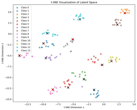 T-SNE visualization of features for the beverages product test dataset. Black crosses mark the prototypes of each class from the test set. Additionally, red dots mark the prototypes belonging to the classes defined as seen, meaning those from which the model was familiarized in the training process.