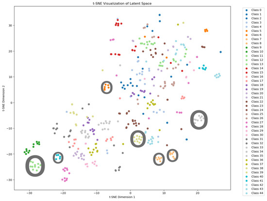 Figure 4 illustrates clearly defined clusters of objects of each class from the test set Figure 5, indicating that the points corresponding to a specific class are close to each other.