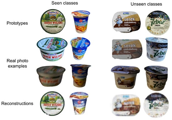 The obtained prototype reconstructions for the test set of dairy products compared with real prototypes and real photos divided into classes whose prototypes were seen in the learning process and classes not seen in the model training phase.