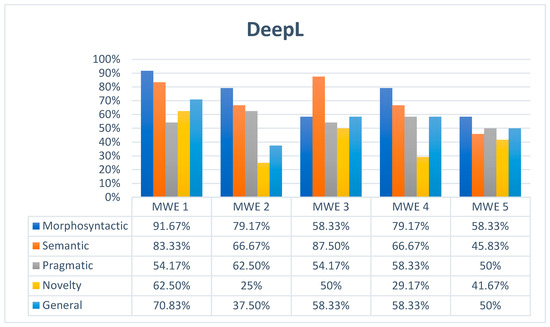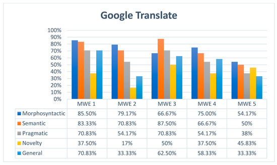 Then, the next NMT system to be evaluated was Google Translate. It performed similarly to DeepL in terms of morphosyntactic and semantic parameters, scoring between 70% and 80% on average. However, it is slightly better on a pragmatic level in some MWEs, namely MWE 1 and MWE 3. In constrast, Google Translate was less novel than DeepL for MWE 1 and MWE 2, but rendered better results for MWE 4 and MWE 5. Despite its similarities in performance, Google Translate was generally less acceptable than DeepL among the evaluators.