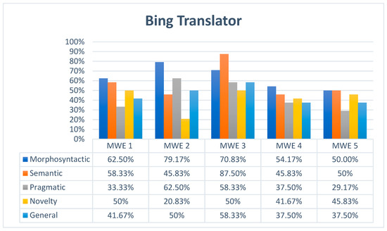 Bing Translator was actually the fourth translation method to be under review in the evaluation rubric, right after the HT. Both morphosyntactically and semantically, this NMT system performed worse than DeepL and Google Translate. Indeed, it did not achieve satisfactory results in terms of semantic parameters for MWE 2 and MWE 3. However, our results reveal that Bing Translator output meets the novelty parameter better than Google Translate, although it still falls short of DeepL’s performance for some MWEs, notably MWE 1 and MWE 2.