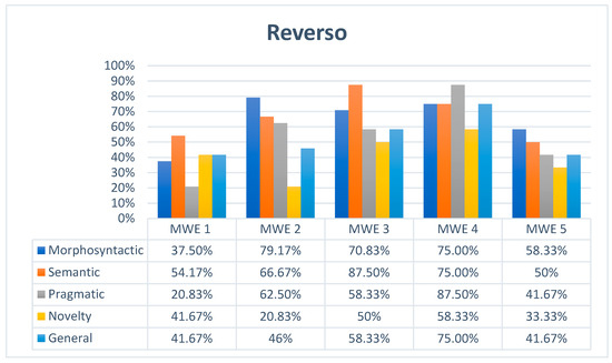 Finally, Reverso was the last NMT system to be evaluated among literary translators. This NMT system showed the greatest variability in performance. Specifically, it demostrated a more than satisfactory level of several parameters, as in the case of MWE 4. However, in other manipulated idioms, as in MWE 1, it was still far below the morphosyntactic or pragmatic levels achieved by previous NMT systems. Regarding the novelty parameter, it usually performed better than Google Translate, but behind DeepL and Bing Translator in some MWEs. Indeed, three out of five MWEs did not reach 50% of acceptance.