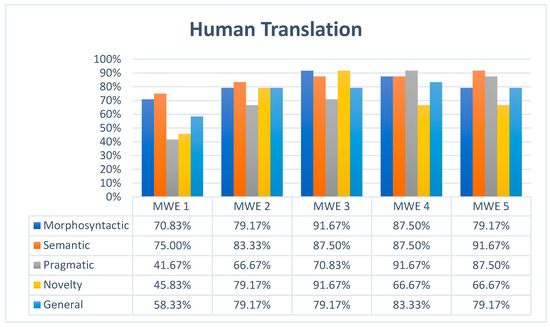 However, there is a certain discrepancy in our findings, as it seems that some NMT systems are not far ahead of HT in terms of acceptability parameters. For example, MWE 1 was the only instance that HT output fell short of DeepL or Google Translate’s performance results. Indeed, our study demonstrates that NMT systems show better results when the manipulated idiom is formed by common vocabulary, hence the NMT systems might process it better. In fact, Zajdel [33] reached a similar conclusion when comparing MT against HT in metaphors, as the study showed that HT specially rendered better results with multi-word metaphors.