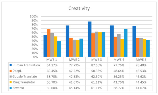Regarding NMT systems, the most creative in this pilot study was DeepL (54.03%), closely followed by Google Translate (53.32%). Then, Reverso slightly outperformed (51.26%) Bing Translator (48.34%). However, the scores of all four translation systems were fairly similar.