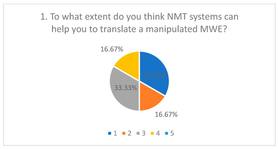 According to the data collected, most respondents were reluctant to use NMT systems to help them translate manipulated MWEs. However, we can see diverse opinions among them, but no one believed that NMT systems should always be used. In fact, most of their answers fell between 1 and 3 on a 5-point Likert scale.