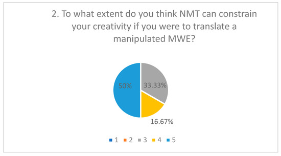 Regarding the second question, half of the participants (three evaluators) believed that NMT systems can constrain literary translators’ creativity when it comes to translating manipulated MWEs. The others are less inclined to use these systems, but no one marked less than a 3 on the 5-point Likert scale.