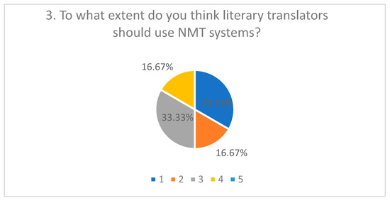 Finally, in the open-ended question, the literary translators also pointed out of that there are some ethical issues that should be considered, some of which were also examined by Taivalkoski-Shilov [20] and Kenny and Winters [38]. For instance, NMT systems might use data that can infringe authors’ and translators’ copyrights or can even constrain literary translators’ creativity.