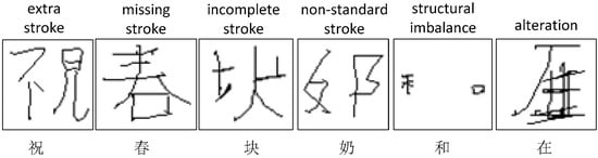 - Bai, H.; Zhang, X. Recognizing Chinese characters in digital ink from non-native language writers using hierarchical models. In Proceedings of the Second International Workshop on Pattern Recognition, Singapore, 19 June 2017; Jiang, X., Arai, M., Chen, G., Eds.; SPIE: Paris, France, 2017; p. 104430A. [Google Scholar] [CrossRef]