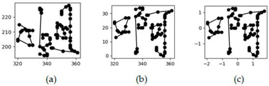There may be redundant points in the trajectory sequence. Removing these points will not change the shape of Chinese characters, but it can effectively reduce the size of input data and the amount of computation. First, adjacent repeating points, except those at the start and end of strokes, are removed, as illustrated in Figure 2a. Next, the sampling points are horizontally flipped to correct the display of Chinese characters, as shown in Figure 2b. Last, x- and y-coordinates are normalized into a standard interval, as shown in Figure 2c. The steps of trajectory normalization are shown in Table 2.