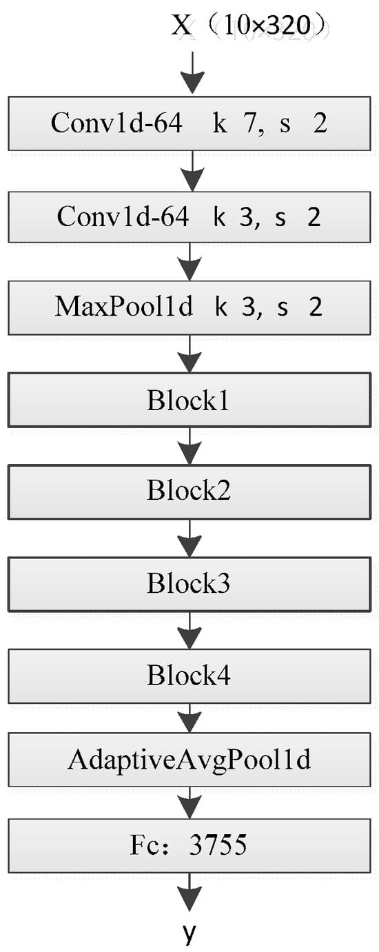 1-D CNN needs to stack many convolution layers to fully extract the context of sequences, so the 1-D ResNetDC is a deep network. After trajectory preprocessing, the input sequence , where T = 320.  is a ten-dimensional vector. X is sent to the 1-D ResNetDC, and the network will predict the Chinese characters category y. The 1-D ResNetDC designed in this paper, as shown in Figure 3, directly processes Chinese characters trajectory sequences. The first layer of the 1-D ResNetDC is a convolutional layer with a kernel size of 7 and a stride of 2, followed by a second convolutional layer with a kernel size of3 and a stride of 2. The third layer is a pooling layer with a window size of 3 and a stride of 2. This is followed by four Block modules, concluding with an average pooling layer and a fully connected layer.
