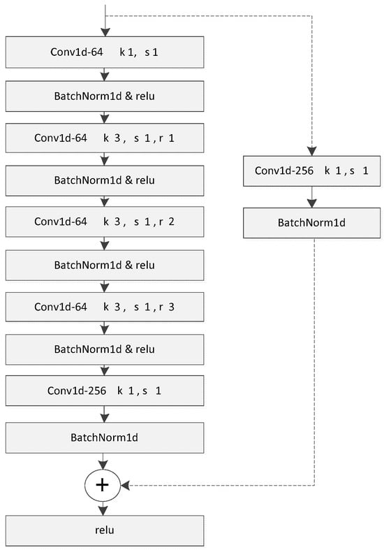 CNNs with large kernels have larger effective receptive fields and higher shape bias, aligning with the human cognitive system that primarily identifies objects through shape cues []. Therefore, the first layer of convolution adopts a relatively large convolution kernel of seven. Simultaneously, deeper convolutional networks contribute to higher classification accuracy, and the use of smaller convolutional kernels facilitates the design of deeper networks []. Consequently, 1-D ResNetDC stacks multiple Block modules to construct a deep convolutional network. Each Block module utilizes convolutional kernels with sizes of three and one. A kernel size of three is the minimum necessary to capture the spatial concepts of left, middle, and right, while a kernel size of one enables cross-channel information interaction. This multi-scale convolution kernel design enhances the expression ability of the 1-D ResNetDC.