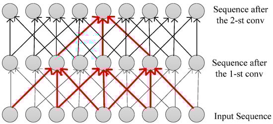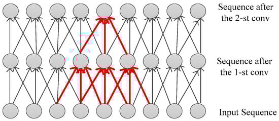 A convolution kernel with size k and dilation rate r is dilated to a size , where , thus expanding the receptive field. Figure 5 illustrates the modeling process of a regular one-dimensional convolution network with k = 3, s = 1, and r = 1. A neuron on the second convolutional layer has a receptive field of five on the input sequence. Figure 6 depicts the modeling process of a one-dimensional dilation convolution network with k = 3, s = 1, and r = 2. In this configuration, a neuron on the second convolutional layer has a receptive field of 9 on the input sequence, demonstrating how dilated convolution effectively expands the receptive field. Since dilated convolution inserts 0 between adjacent elements of the convolution kernel, the actual sampling points participating in the calculation in the range of  size are only k, so each neuron in the dilated convolution layer can only view the information in a non-continuous manner, leading to significant information loss. This is known as sparse sampling, as illustrated in Figure 6.