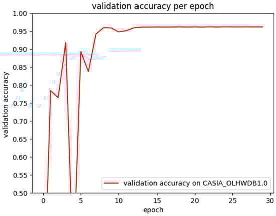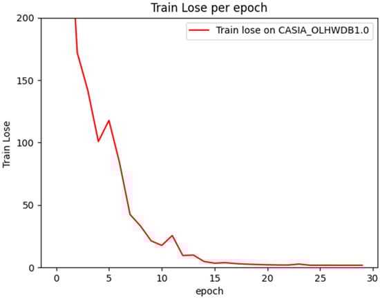 DICCR for international students is a specific task. Although there are relatively few samples in the dataset, it still takes a significant amount of manpower to label the samples. Therefore, this paper chooses to pre-train the proposed model on the public dataset CASIA-OLHWDB1.0. The training loss and verification accuracy of the model on CASIA-OLHWDB1.0 are shown in Figure 7 and Figure 8.