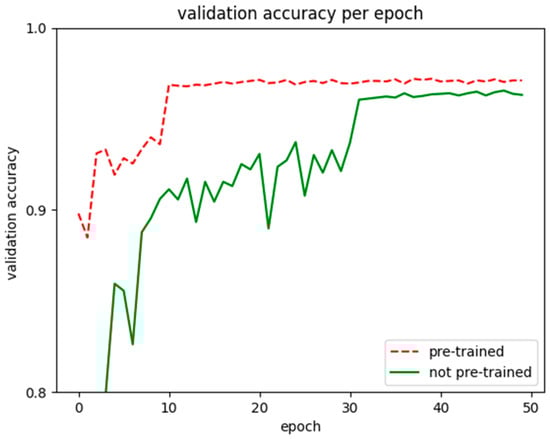 The model parameters are further trained with the DICC dataset of international students, and the accuracy changes are shown in Figure 9. The results demonstrate that the model pre-trained on the CASIA-OLHWDB1.0 dataset achieves higher classification accuracy, reaching 97.2%, compared to 96.5% without pre-training.
