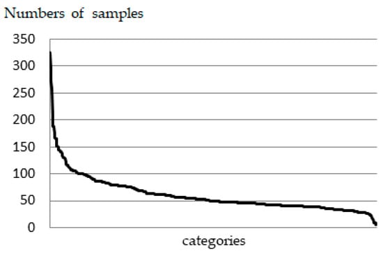 The DICC dataset for international students was collected during classroom teaching sessions for “Zero Starting Point” international students at Beijing Language and Culture University. Students used an Anoto digital pen to write on dot matrix paper, capturing the DICC text, which was then segmented into individual Chinese characters []. The dataset includes 525 categories of Chinese characters, with the number of samples per category ranging from a few to over 300. The dataset comprises 31,734 samples. Figure 10 displays the number of samples per category in descending order. To address the imbalance in this dataset, we pre-train the model on the CASIA-OLHWDB1.0 dataset, thereby mitigating the adverse effects of data imbalance during training and avoiding complex processing techniques.