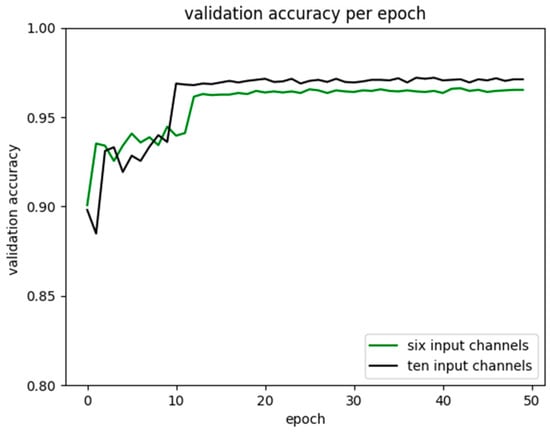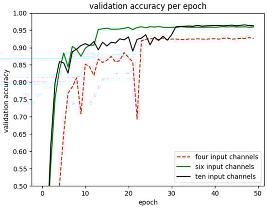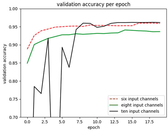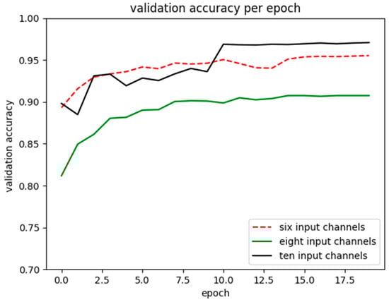 The training loss and verification accuracy of the network are compared, as shown in Figure 17 and Figure 18. After 32 epochs, the training of the network is basically completed. The training loss is close to 0, and the verification accuracy is stable. The convergence speed and verification accuracy of the four-dimensional representation method are the worst. The six-dimensional representation method converges fastest, but the ten-dimensional representation has the highest validation accuracy. Adding more discriminative features to the feature representation can further improve recognition accuracy.