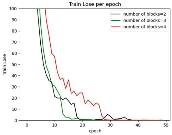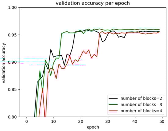 It can be seen that the network with three Block modules has the smallest training losses and the highest verification accuracy. Although the Block module with a residual structure effectively solves gradient vanishing and exploding, which makes the deep network more conducive to feature learning and improving classification accuracy, there is no positive correlation between the number of Block modules and the accuracy of recognition. This does not mean that the deeper the network is, the better the performance. Experimental results suggest that configuring three Block modules in the 1-D ResNetDC is the most optimal setup.
