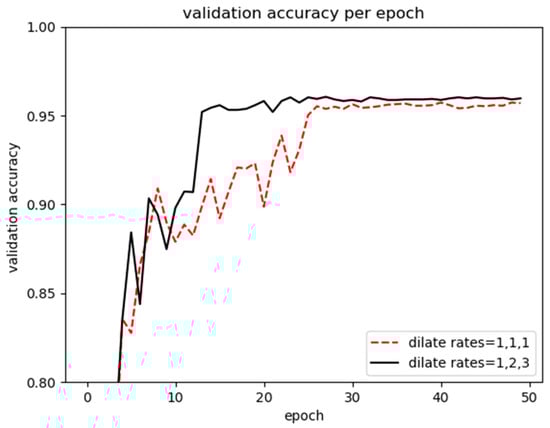 To verify the role of dilation convolution in the 1-D ResNetDC, we compare the classification effects of an ordinary convolution network and dilation convolution network. In the 1-D ResNetDC shown in Figure 3 and Figure 4, the number of Block modules is set to three. For the three convolution layers with a kernel size of 3 in each Block module, in an ordinary convolution network, the dilation rates of these three convolution layers are all set to 1, while in the dilated convolution network, the dilation rates of these three convolution layers are set as [1, 2, 3] respectively. Figure 15 presents the training loss for both networks, while Figure 16 illustrates their validation accuracies.