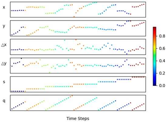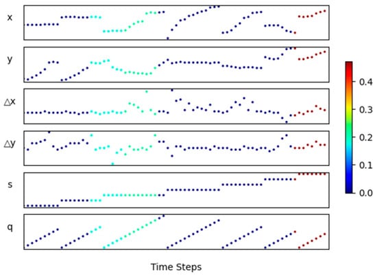 Grad-CAM [] is used to visualize the contribution of different trajectory points for the classification decision of the 1-D ResNetDC. In 1-D ResNetDC, the dilation rate of the convolution layer with kernel size three in the Block module is set to one, which is called an ordinary convolution network. Figure 25 and Figure 26 show the most concerned time steps with an ordinary convolution network and 1-D ResNetDC, respectively, when classifying digital ink Chinese character “典”. Six sub-graphs in Figure 25 and Figure 26 present six-dimensional representations  of trajectory sequences.