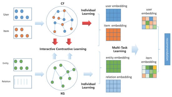 In the era of information explosion, users are confronted with an overwhelming number of choices. Recommendation systems alleviate this issue by providing personalized recommendations [,,], helping users quickly find content or products of interest, thus reducing information overload and enhancing user satisfaction and experience. For e-commerce and content platforms, recommendation systems can efficiently guide users to content they are more likely to purchase or consume, significantly boosting conversion rates and sales, thereby directly increasing economic benefits for businesses. Collaborative filtering algorithms, widely employed in recommendation systems, leverage users’ historical behavior data to provide personalized recommendations for each user, improving the relevance of recommendations and user satisfaction [,,,]. However, real-world data often present challenges such as cold start and sparse data, which greatly limit the performance of collaborative filtering-based recommendation algorithms [,,]. To address the issue of sparse data, an effective approach is to integrate auxiliary information into the collaborative filtering recommendation model, and knowledge graph-based recommendation is a typical method in this regard [,,,,].
