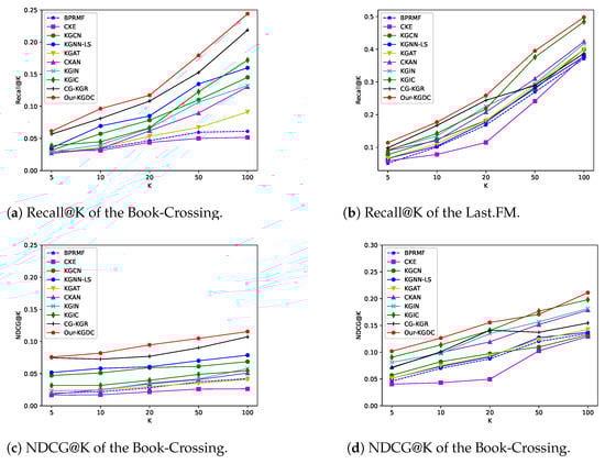 Similar to CTR-based recommendations, KGDC shows greater improvement on the Book-Crossing dataset compared to the Last.FM dataset when K = 10, 20, 50, and 100. This further demonstrates that the proposed method can extract more valuable information from semantically rich knowledge graphs while maintaining the dominant role of CF information and preventing interference from irrelevant redundancies of KG.
