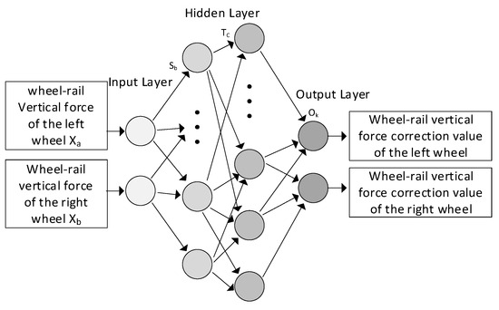 In the output layer [28], represents the corrected wheel–rail contact force of the kth node (k = 1, 2, ···, m, where m is the number of neurons); is the weight between two layers; and is the bias of each layer node. S, T, and O are the output values of each node in the first hidden layer, the second hidden layer, and the output layer, respectively; u, h, and i are the number of nodes in the first hidden layer, the second hidden layer, and the output layer, respectively.