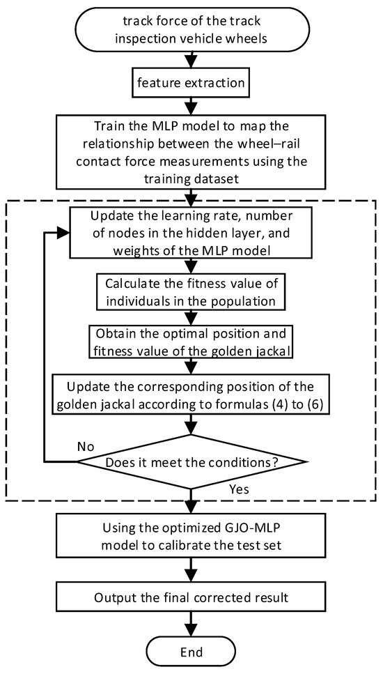 For safety reasons, instrumented wheelsets cannot be mounted on heavy-load trains, and the existing methods of measuring wheel–rail contact force cannot easily achieve fast, precise, and continuous wheel–rail contact force measurements for heavy-load trains. For this reason, inspired by the powerful multilayer nonlinear map-ping capability of deep learning, a golden-jackal-optimized multilayer perception machine (GJO-MLP) collaborative calibration model for the wheel–rail contact force of heavy-load trains is proposed in this paper. A railway inspection vehicle’s wheel–rail contact force data are used to determine a heavy-load train’s wheel–rail contact force. By mapping the wheel–rail contact force connection with the proposed model, the actual continuous wheel–rail contact force of a heavy-load train may be calculated, aiding studies on the operation and maintenance of such trains. The overall flow of the algorithm is shown in Figure 1.