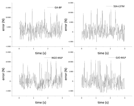 By comprehensively considering the results in Table 2 and Figure 6, as well as the fairness of each algorithm, the conclusion can be drawn that compared with the other three algorithms, the proposed model based on GJO-MLP has a smaller absolute error in the calibration of the wheel–rail contact force for a heavy-load train running on the Baotou–Shenmu Railway. This result clearly demonstrates the advantage of GJO-MLP in building relational mapping models.