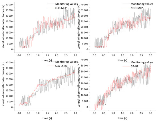 Because the optimization algorithm was used to optimize the weights, the training time of the MLP was greatly reduced to only 26 s. Compared with the original MLP network, the training time was cut down by about 50%, which is a very significant improvement. Compared with those of GA-BP and NGO-MLP, the training time of GJO-MLP was also improved by about 32% and 25%, respectively. Although the training time of the SSA-LSTM model was only 22 s, which is less than that of GJO-MLP, its other three indicators were all inferior to those of GJO-MLP. Hence, the GJO-MLP method presented in this research demonstrated superior performance when compared to the other models. It has a higher operating efficiency and is more suitable for use in establishing the wheel–rail contact force data relationship mapping model between a railway inspection vehicle and a heavy-load train.