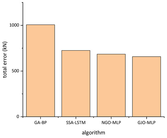 It can be seen in Figure 7 that GJO-MLP demonstrated a better calibration ability on data from the 600 m radius curved line section on the Baotou–Shenmu Railway. In this experiment, NGO-MLP was slightly inferior to GJO-MLP, while SSA-LSTM and GA-BP were relatively poor. The values in Table 3 indicate that GJO-MLP had the lowest RMSE and MAPE, outperforming the other three algorithms. From this and the information in Figure 8, it can be concluded that GJO-MLP had the smallest total absolute error. In summary, the collaborative calibration results from GJO-MLP for the data from a small-radius curved-line segment on the Baotou–Shenmu Railway are optimal and exhibit superior robustness.