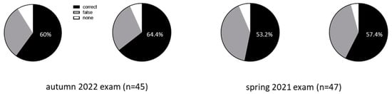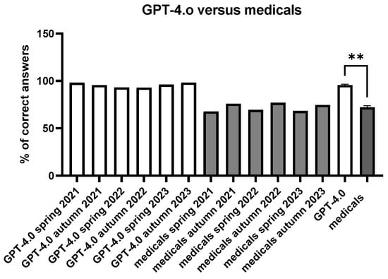 In a third set of experiments, we aimed to evaluate the performance of GPT-4.o in comparison to medical students. To this end, anatomical gross macroscopy, microscopy, and embryology test questions were obtained from six different exams from the Thieme examen online website (id est; spring 2021–2023 and autumn 2021–2023), and the performance of GPT-4.0 was compared with the results of medical students (retrieved from the data repository of https://www.impp.de/pruefungen/medizin/l%C3%B6sungen-und-ergebnisse.html (accessed on 1 August 2024)). The total number of valid questions in this last part of the study was 344. Again, questions related to or including anatomical images or drawings were excluded, and responses were categorized as either correct or incorrect.