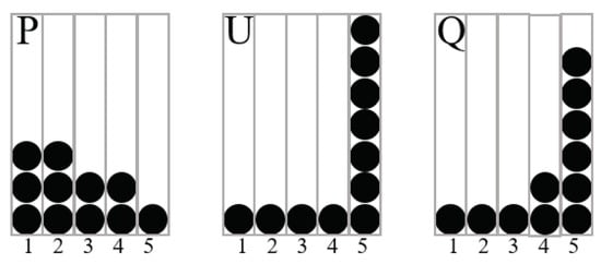 The special case is presented in Figure 1. A total amount of elements are arranged into cells to compose the distributions. As introduced above, the P distribution has a monotonically decreasing order, and the U distributions assign a quantity of to the last cell. The special case is represented by the Q distribution, which assigns a quantity of 2 to the -th position and a quantity of to the last position. For all the distributions, for every cell, a minimal quantity of 1 is assigned. The goal is to show that: