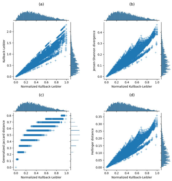 In what follows, scatter plots are used for investigating differences between the compared measures when they are applied to measure the distance/divergence between two quantized distributions. Each point within the scatter plot represents a specific pair of distributions that are put in comparison. The position of the point within the plot depends on the values of the compared measures. For example, in Figure 2a, the classical Kullback–Leibler divergence is compared with the proposed unnormalized Kullback–Leibler divergence, respectively, on the axis of ordinates and the axis of abscissae. Thus, the coordinates of a point representing a specific pair of distributions are given by the KL divergence and the NKL divergence between them. Since a relatively huge number of two-by-two distribution comparisons are made, many points overlap in the same area of the plot. Thus, the chart is also equipped with two histograms located beside the axes that report the number of instances that fall within a given range of values.