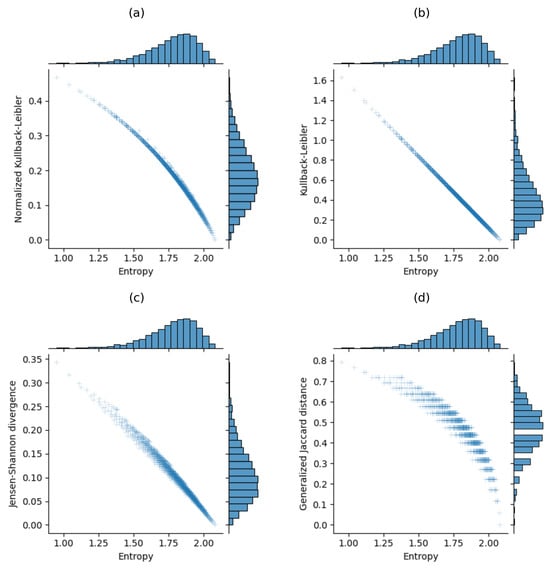 Scatter plots generated by putting in relation four of the investigated measures and the entropy of the set of monotonically ordered distributions, generated with 8 cells and 32 dots, and the corresponding uniform distribution: (a) normalized Kullback–Leibler divergence, (b) unnormalized Kullback–Leibler divergence; (c) Jensen–Shannon divergence; (d) generalized Jaccard distance.
