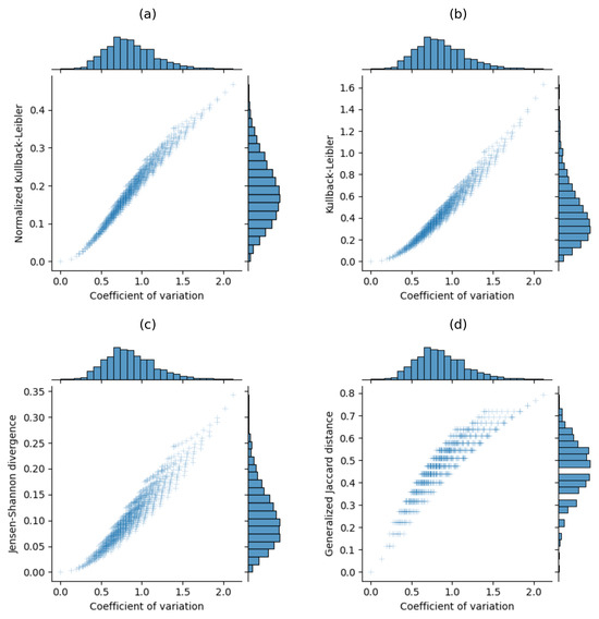 Scatter plots generated by putting in relation four of the investigated measures and the coefficient of variation of the set of monotonically ordered distributions, generated with 8 cells and 32 dots, and the corresponding uniform distribution: (a) normalized Kullback–Leibler divergence, (b) unnormalized Kullback–Leibler divergence; (c) Jensen–Shannon divergence; (d) generalized Jaccard distance.