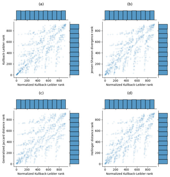 Entropic divergences and other measures can be used to prioritize elements with respect to their deviance from randomness or, generically, from a background model. Thus, it can be interesting to study how the rank assigned to elements, based on their divergence, changes when the four different measures are used. In what follows, the uniform distribution is used as the background model, and the measure of divergence from it is calculated for the set of ordered distributions that can be formed by taking into account the same quantity that is distributed in the uniform shape. For the experiments, a number of cells equal to 8 and a total quantity of 32 have been considered. In this way, the uniform distribution assigns a quantity of four to each cell. The difference with respect to the previous experiments, where 5 cells and 15 elements are considered, is because the previous experiment generates only 30 distinct ordered distributions, which is a relatively small number. On the contrary, a setup with 8 cells and 32 elements generates a high number of unordered distributions (2,629,575) that leads to a huge number of two-by-two comparisons. As a pro, the new setup generates 919 ordered distributions, which can be considered sufficient to draw experimental conclusions.