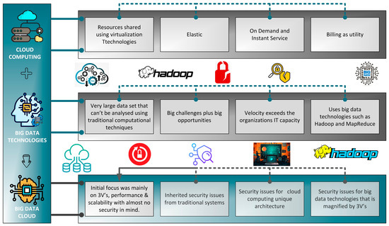 The main ingredients of the BDC are required to be understood to address the security issues produced from the features and unique architecture of the existing systems. The basis is usually defined in a cloud layer and BD technologies, as can be seen in Figure 3.